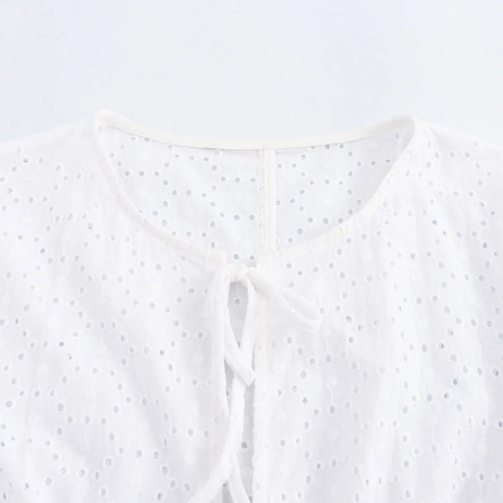 Aquana White Floral Embroidery Long Sleeve Front Lace Up Top