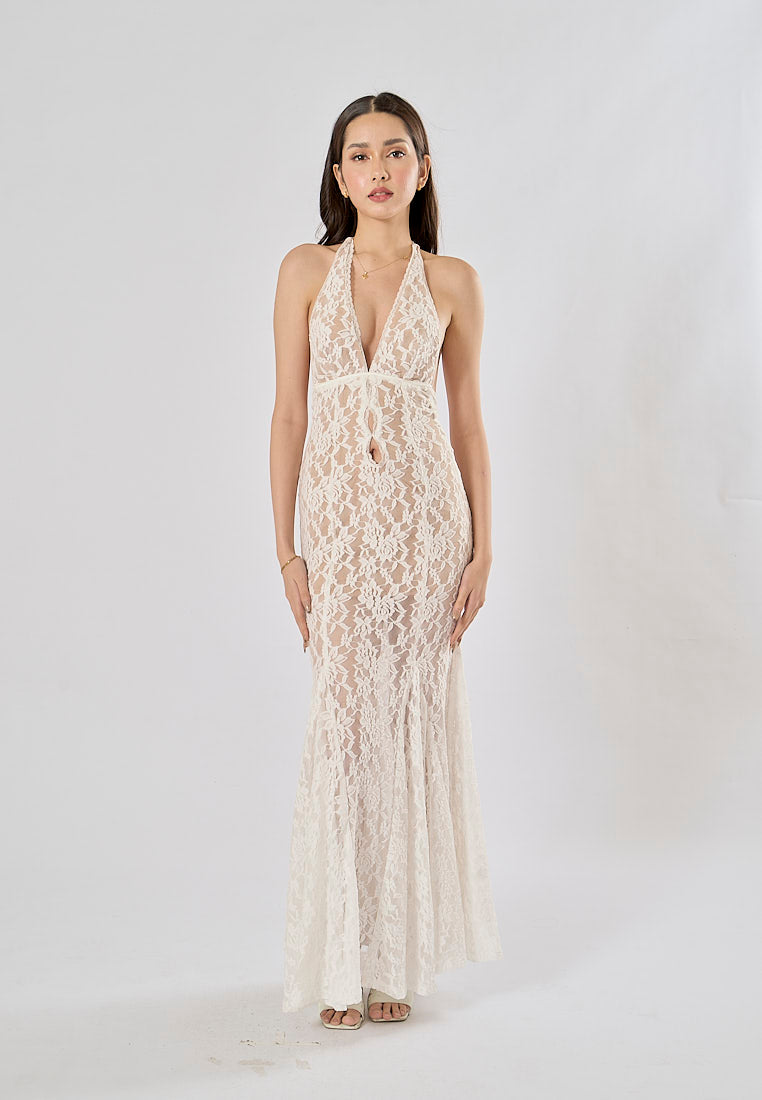 Luna White Halter Deep V-Neck Mermaid Maxi Dress