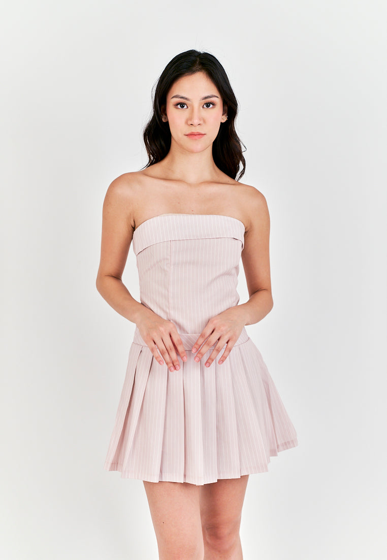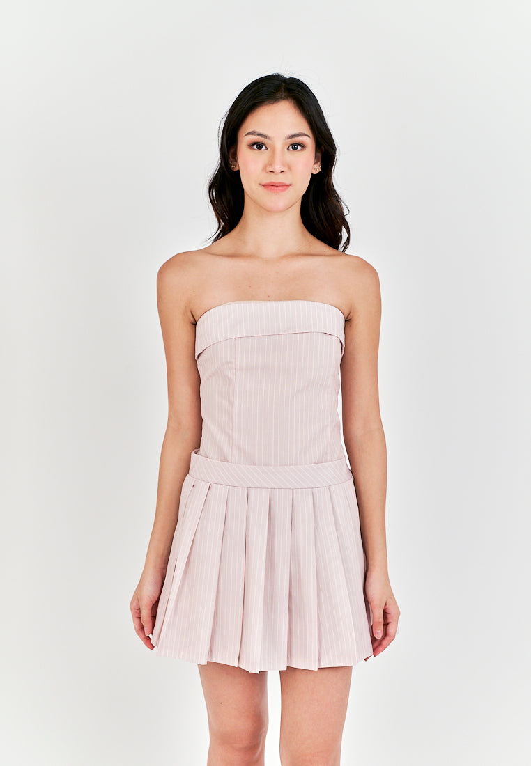 Jenah Biege with White Stripes Print Folded Neckline Pleated Mini Dress