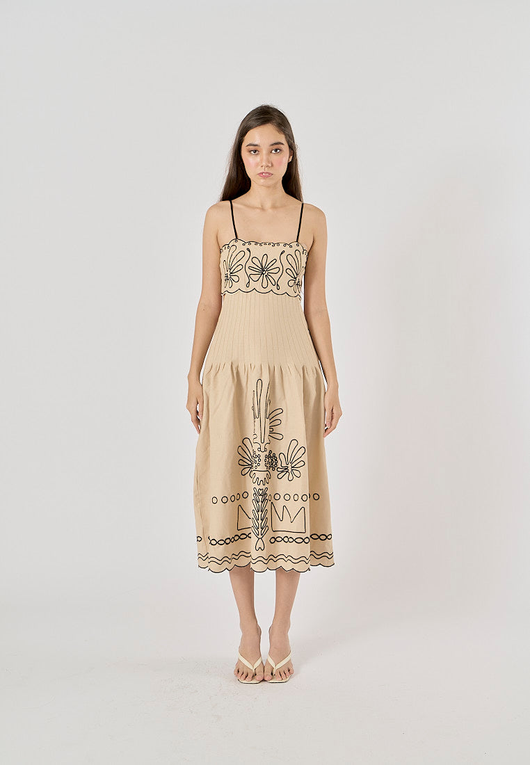 Elspeth Beige Embroidered Floral Knitted Midi Dress