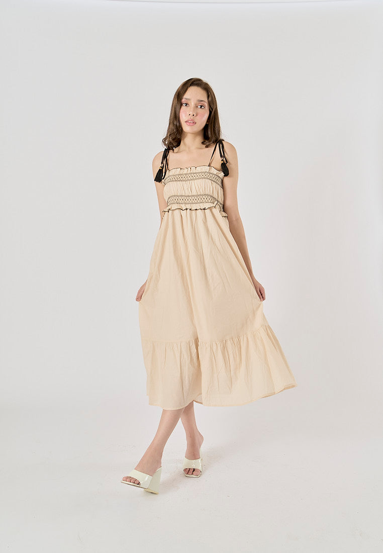Texas Beige Floral Embroidery Ruffle Boho Midi Dress