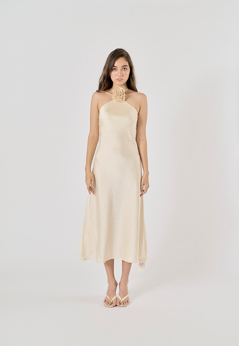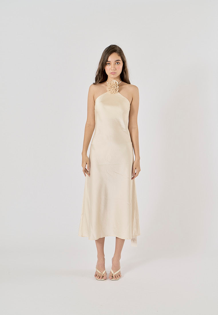 Kova Beige Detachable Flower Applique Halter Neck Midi Dress