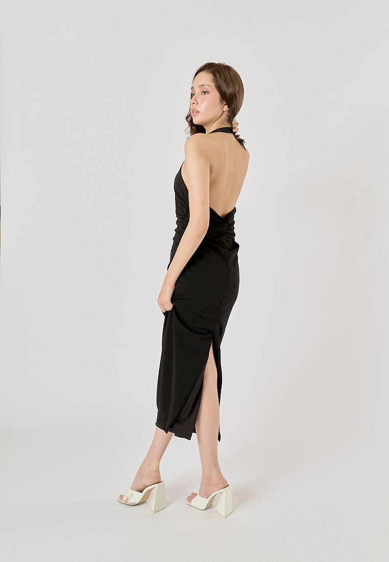 Miciela Black Sleeveless Sexy Back Ruffled Side Slit Midi Dress