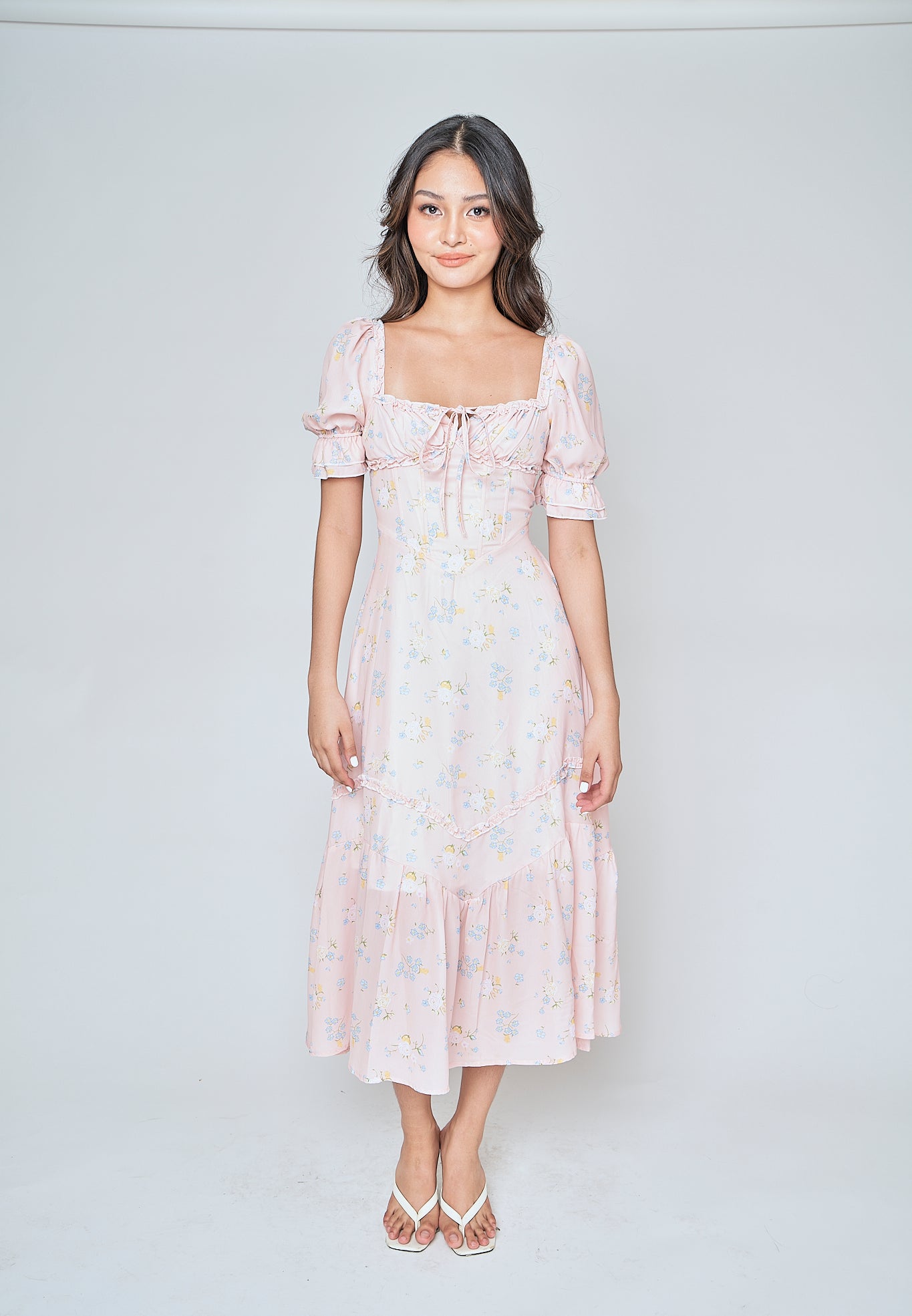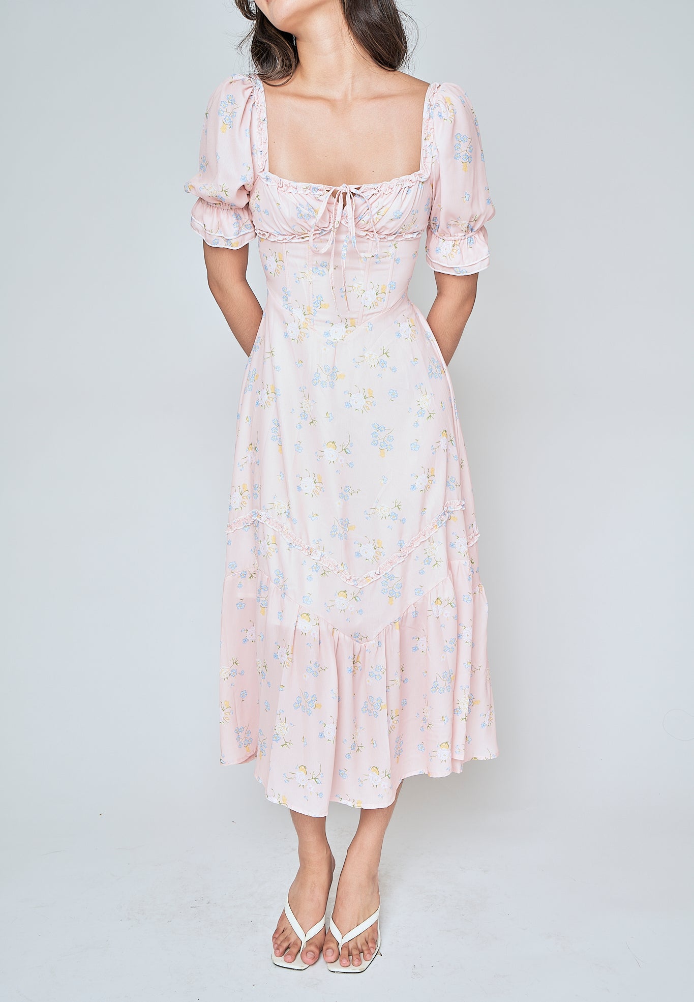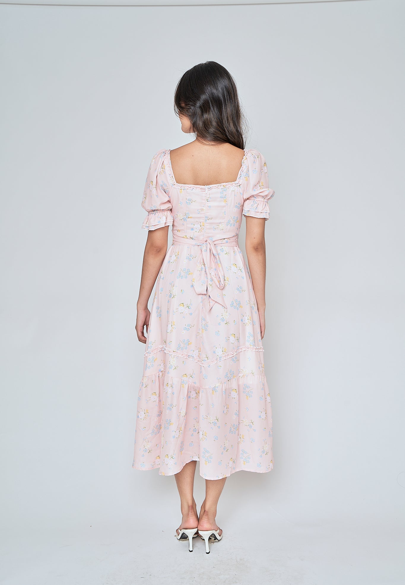 Natalia Blush Pink Floral Square Neck Short Sleeves Lined Waist Midi Dress