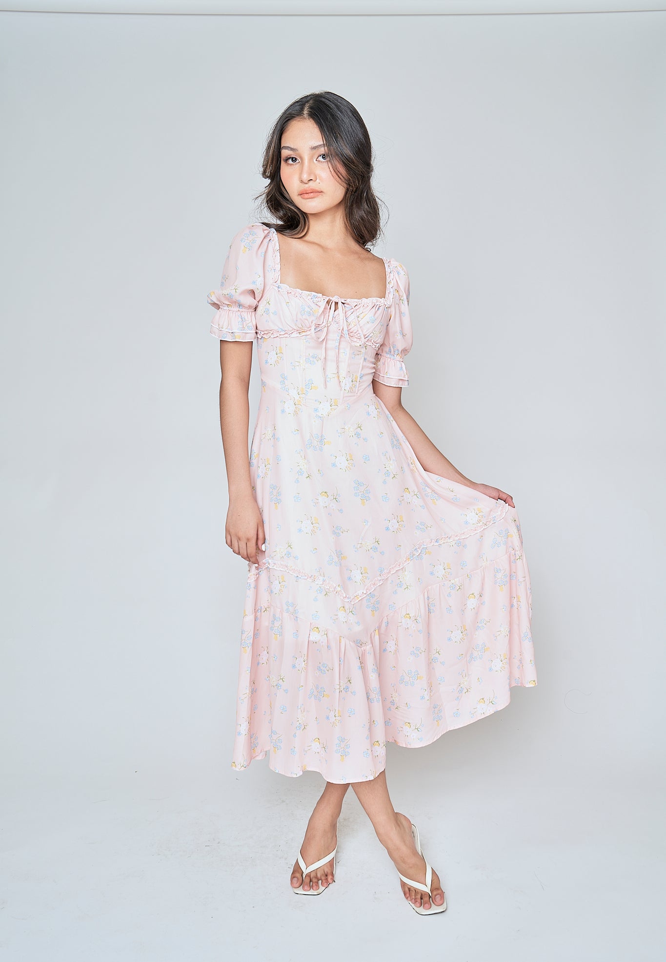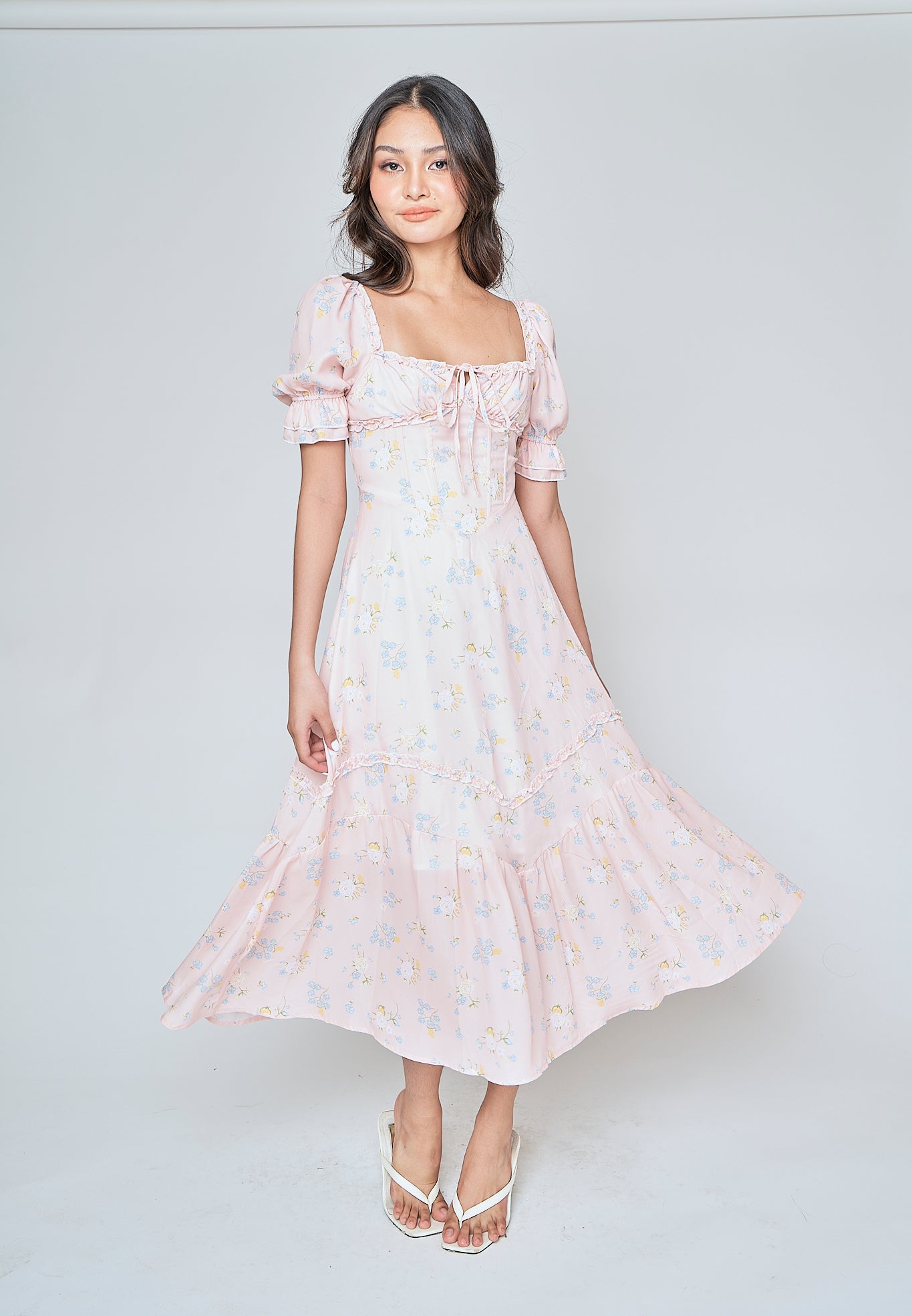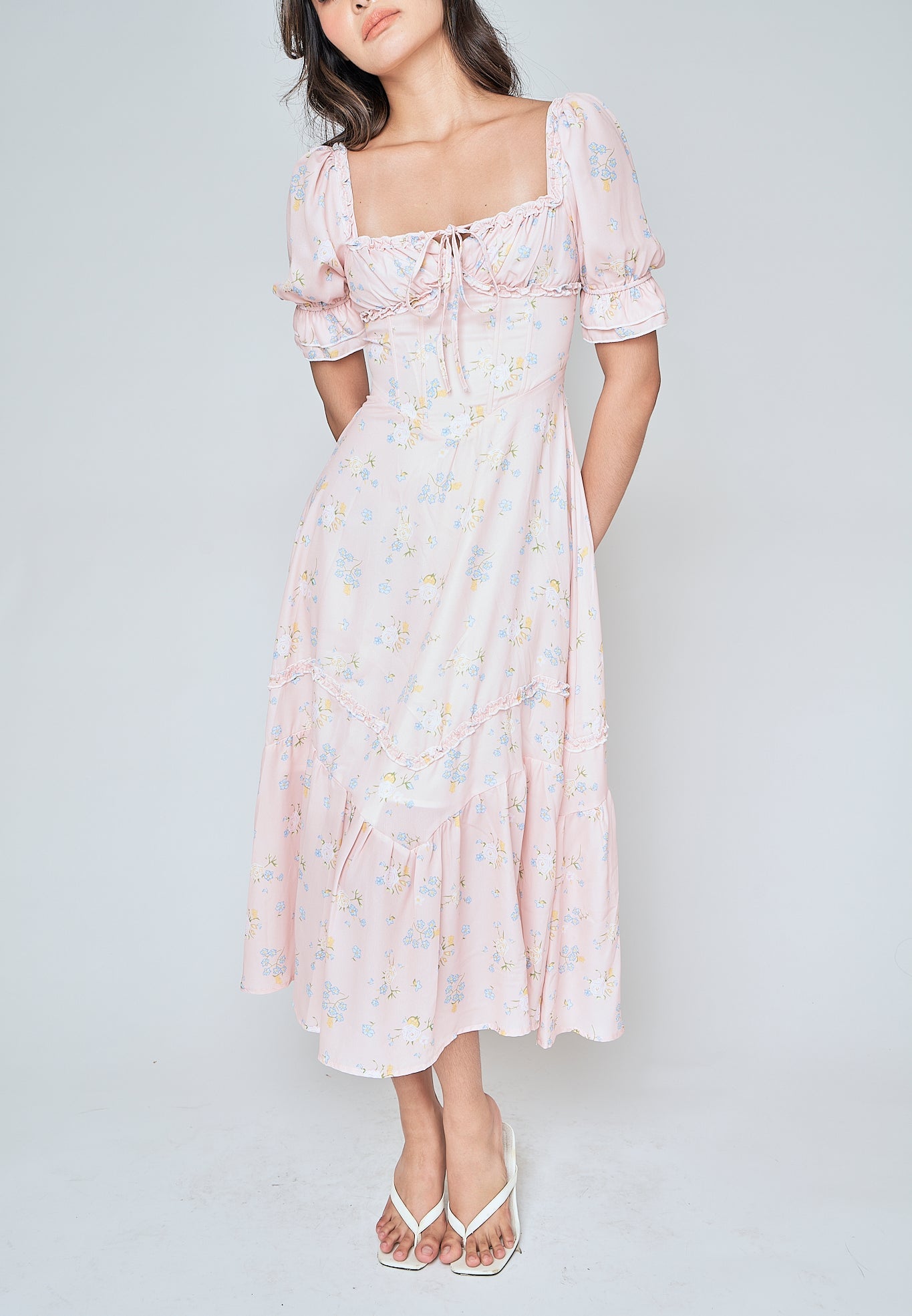 Natalia Blush Pink Floral Square Neck Short Sleeves Lined Waist Midi Dress