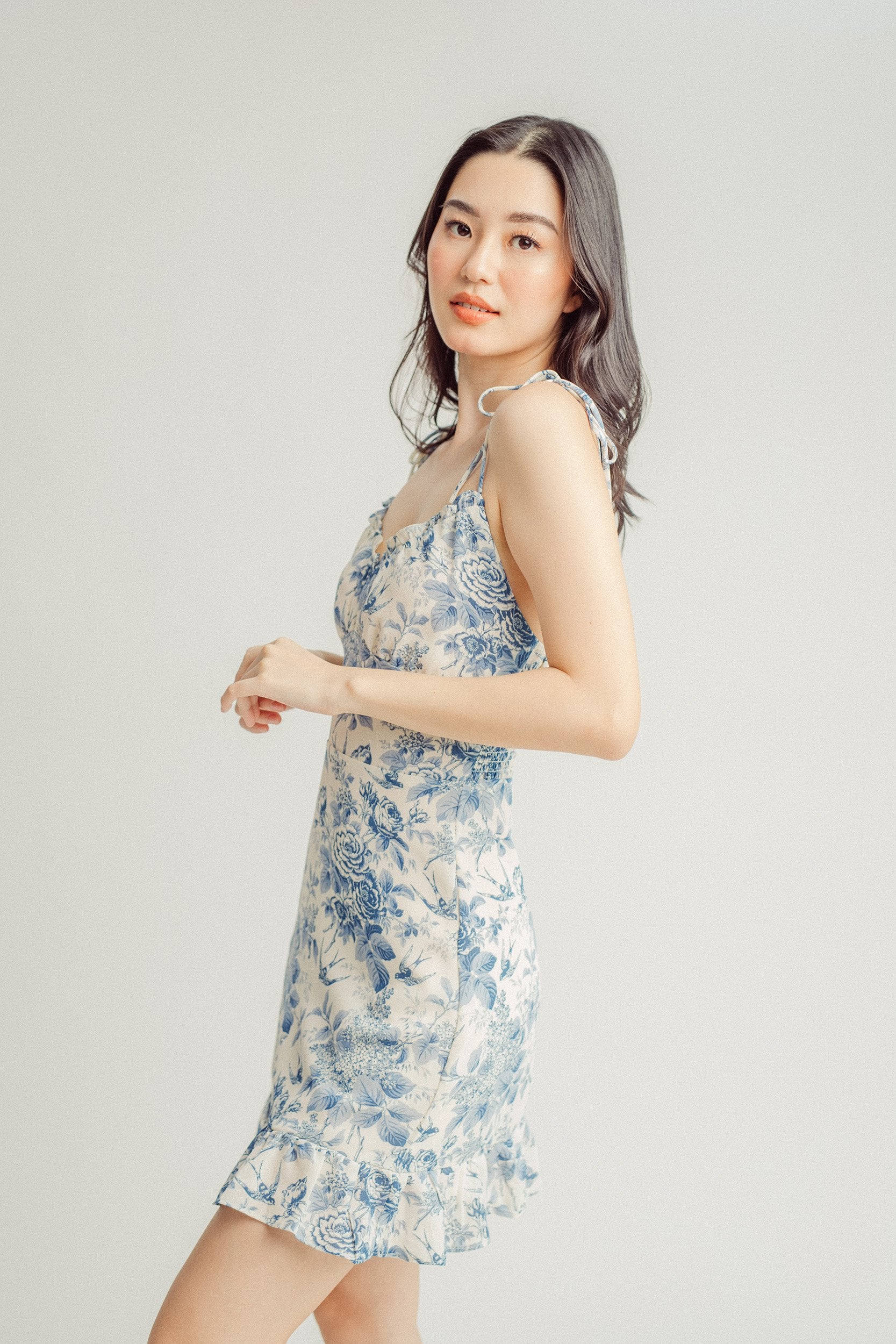 Vera Light Blue Floral Self-Tie All Over Print Ruffle Hem Mini Dress
