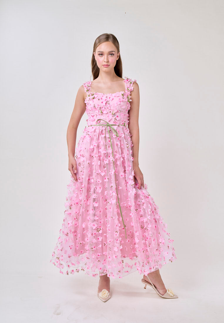 Millie Pink Square Neck 3D Cherry Blossom Flower Midi Dress