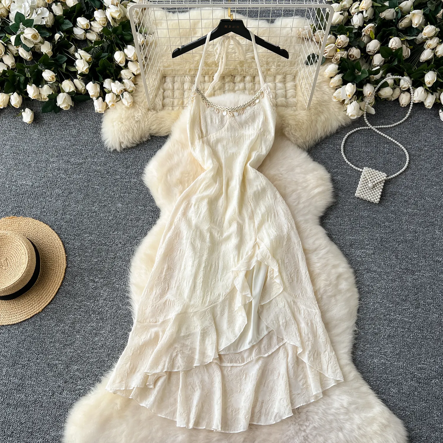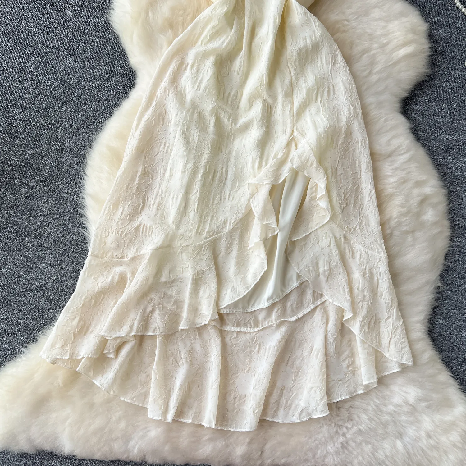Aine Cream Halter Sleeveless Ruffled Tassel Lace Midi Dress