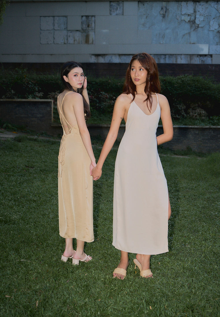 Kailani Beige Cowl Neck Sleeveless Adjustable Strap Slip Midi Dress