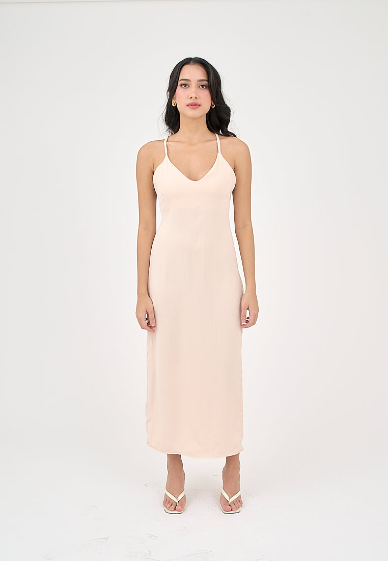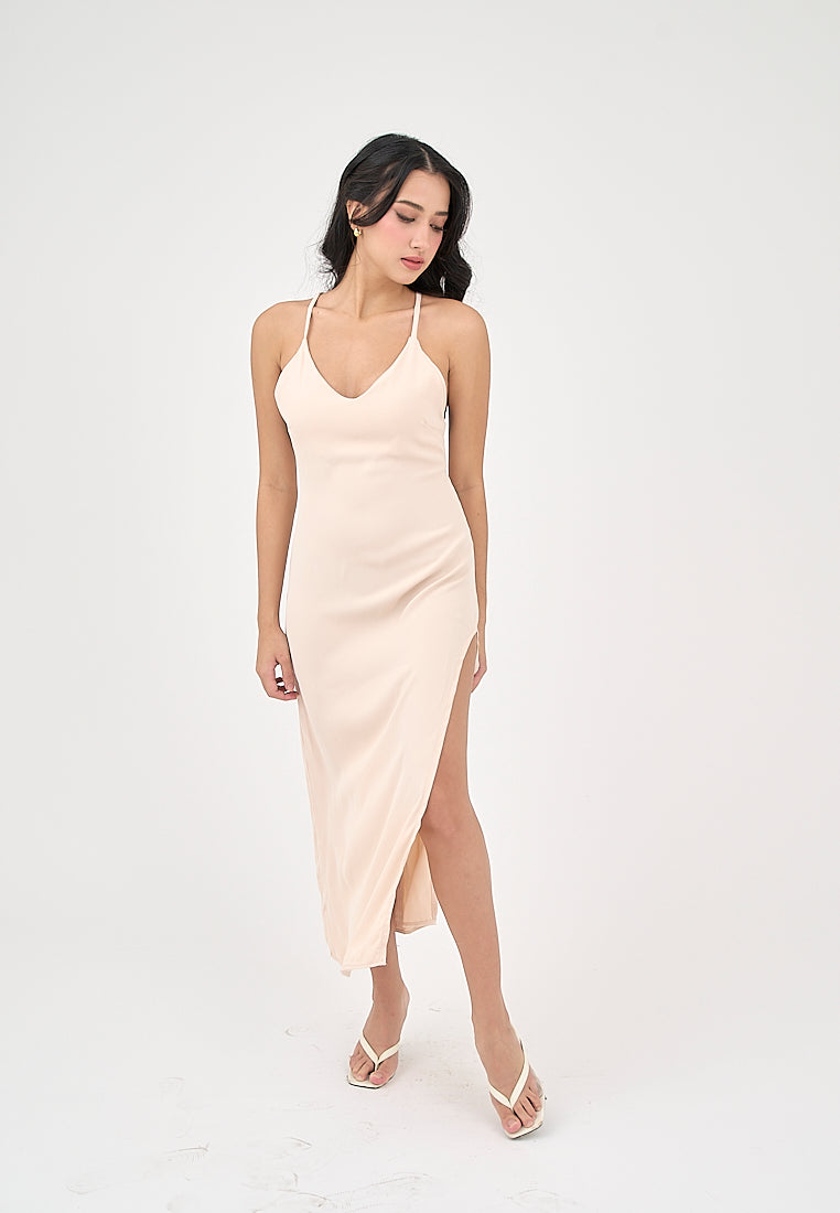 Aeryn Beige Ruch Bust Sleeveless Criss Cross Back Midi Dress with Slit