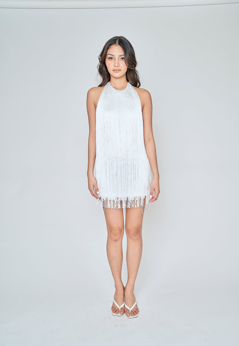 Ariyah White Fringe Layer Halter Open Back Sleeveless Mini Dress