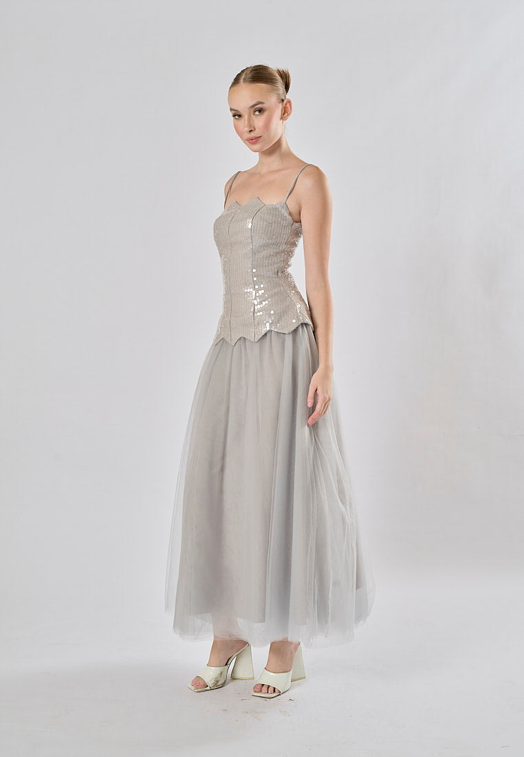 Rayla Gray Sleeveless Sequins Tulle Midi Dress