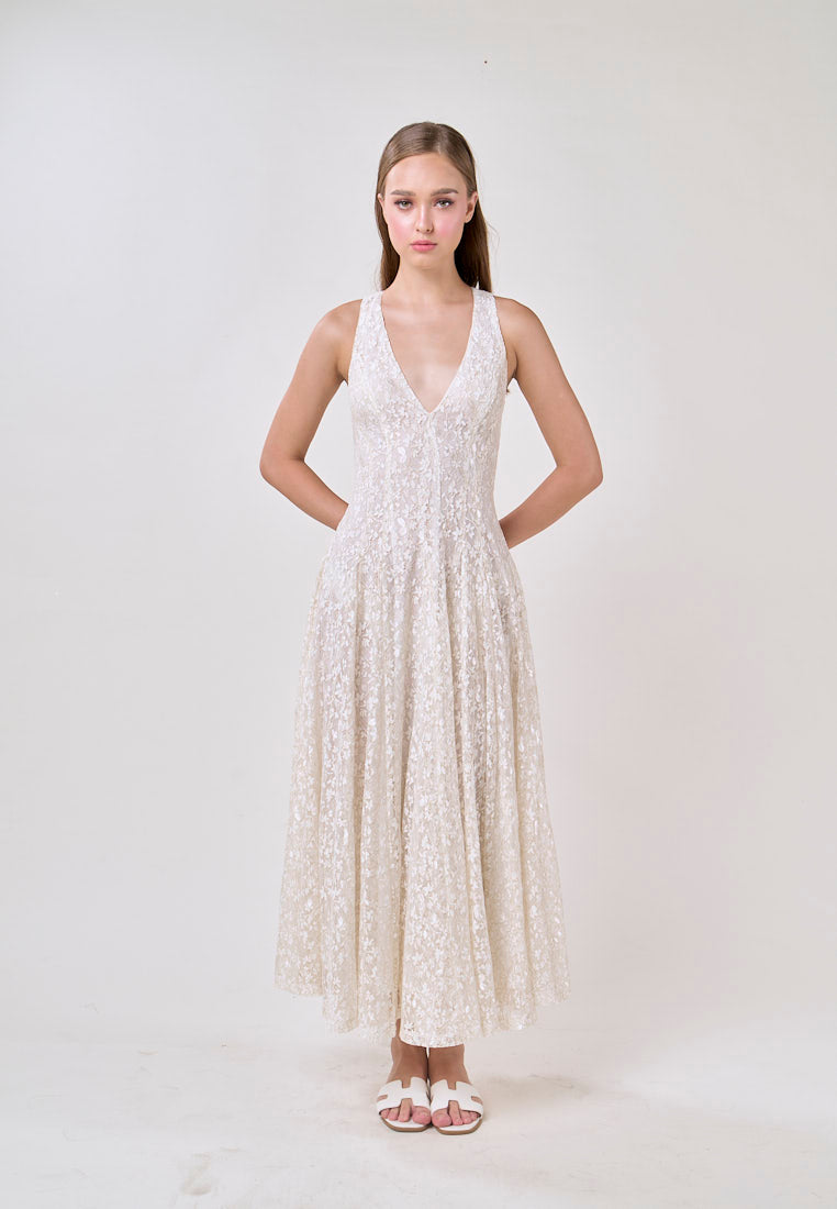 [FOR RENT] Heidi White Deep V-Neck French Lace Maxi Dress