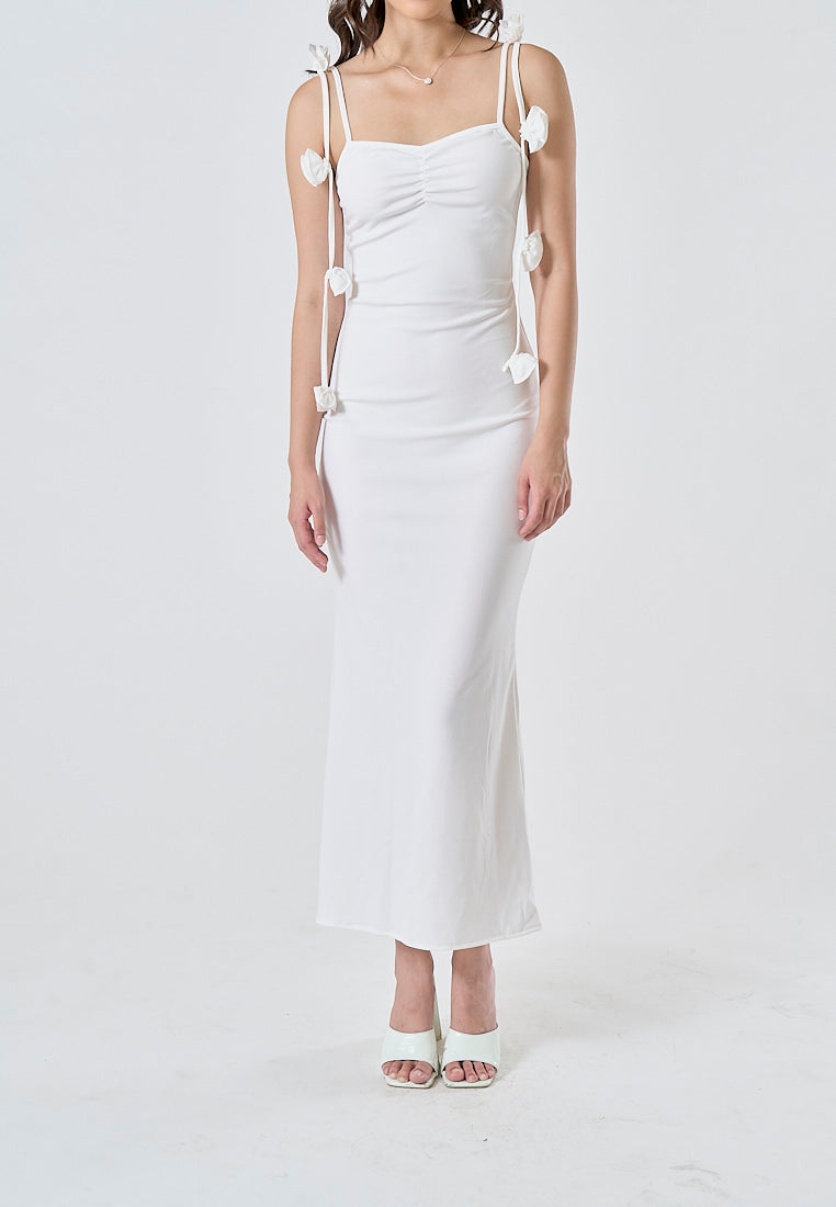 [FOR RENT] Delanie White A-Line Satin Scoop Back Ribbon Midi Dress