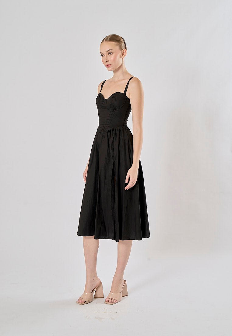 Yara Black V-Neck Shoulder Pad Slim Hip Midi Dress