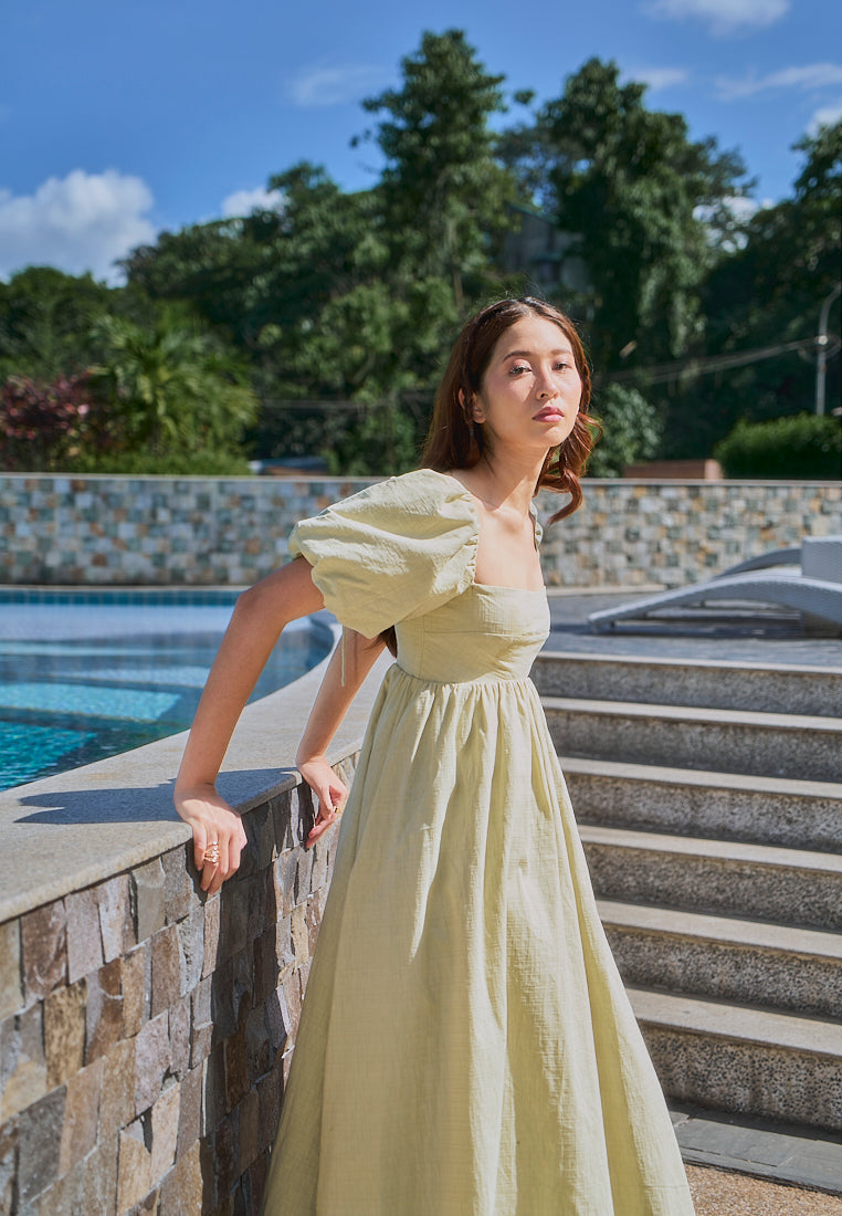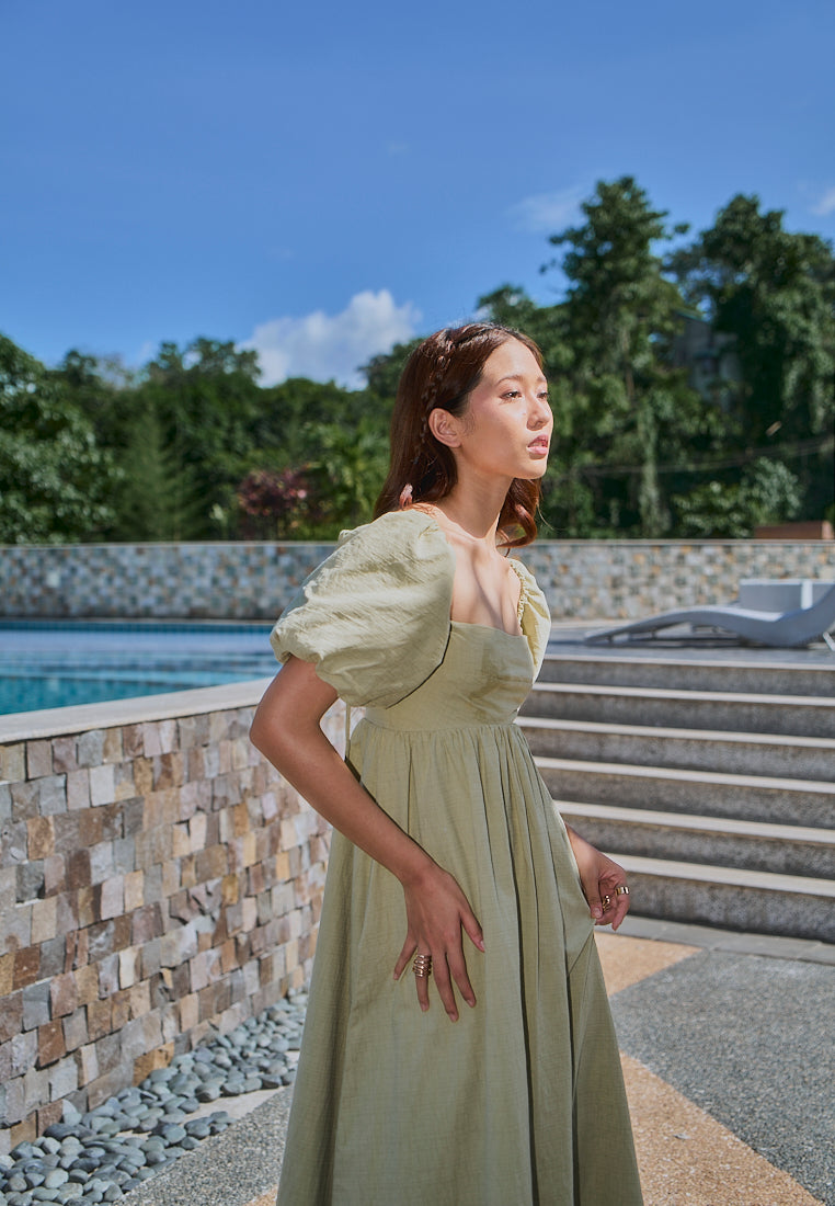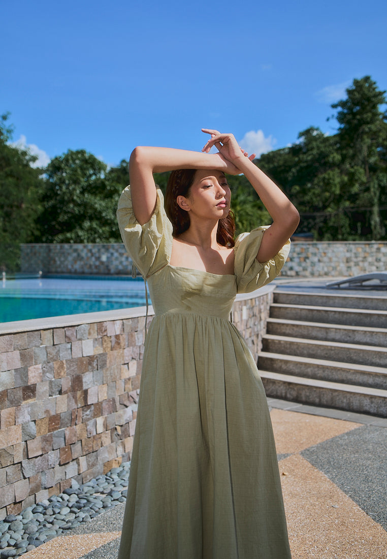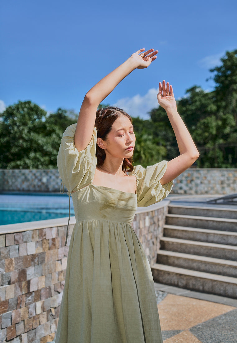Hilda Sage Green Square Collar Lantern Sleeve Midi Dress