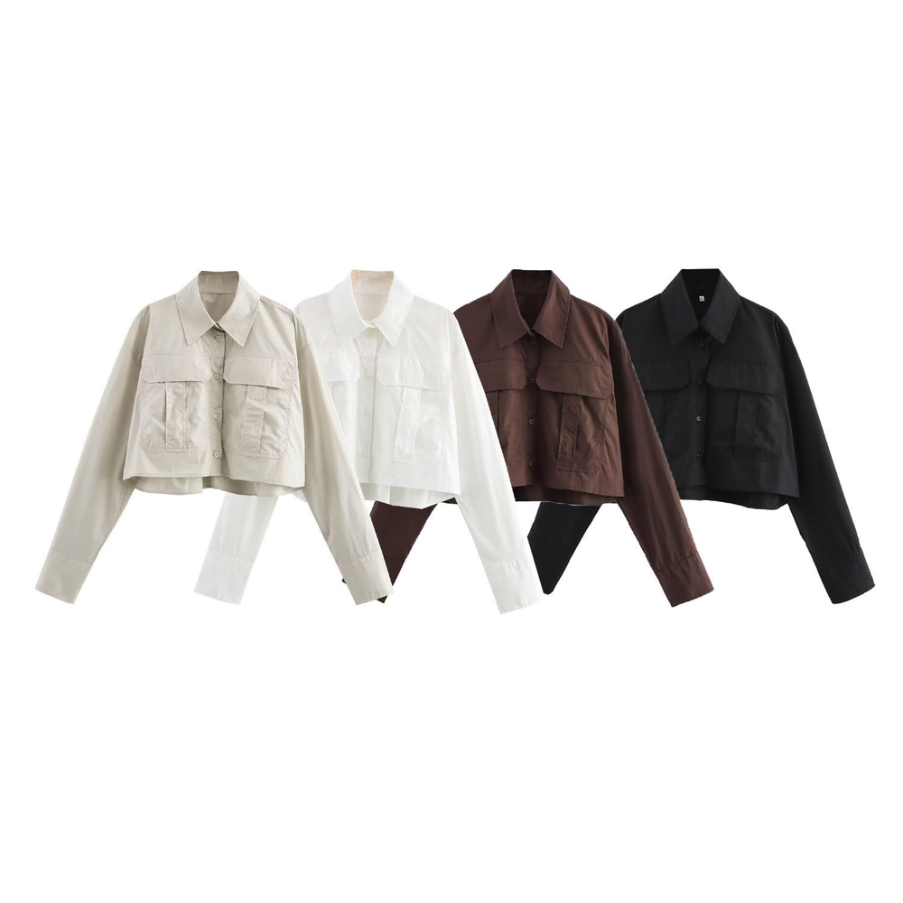 Ace Brown Turn Down Collar Casual Loose long Sleeve Crop Top