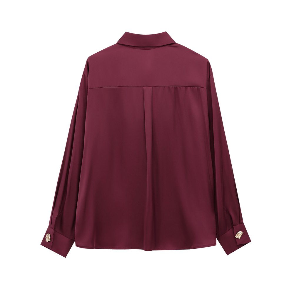 Caspian Burgundy Satin Turn Down Collar Long Sleeve Top